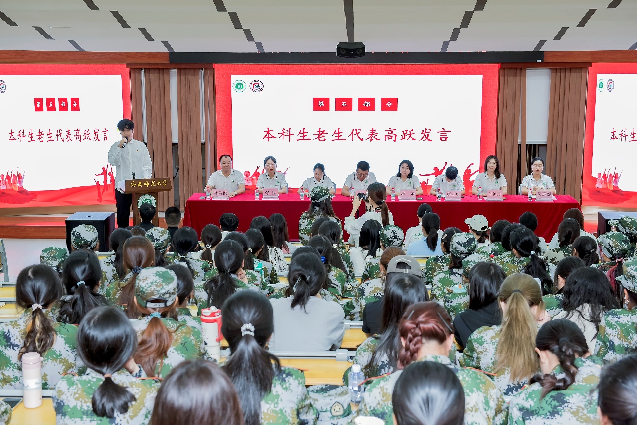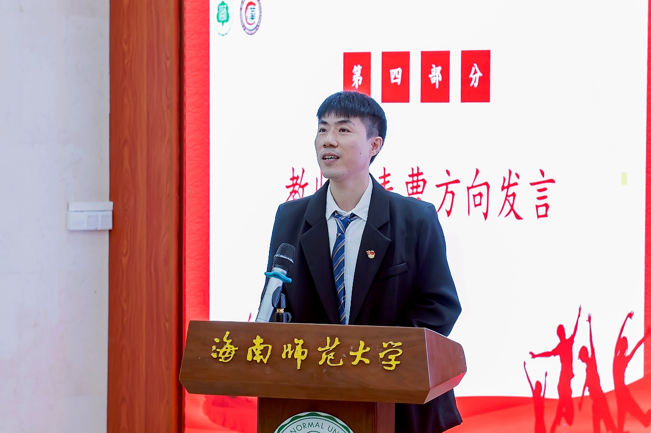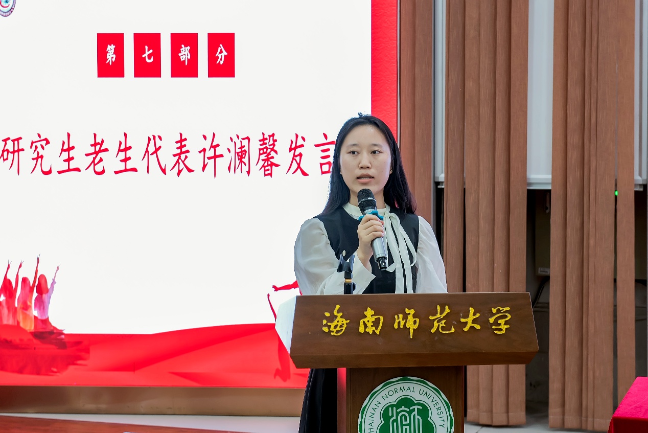 本科生老生代表高跃同学回顾了自己在海师的成长经历,并分享了三点体会:一是“心向大海,明确航向”,主动挖掘资源,明确未来方向;二是“学在海师,乐在国教”,平衡学习与生活;三是“勇立潮头,敢闯敢试”,勇于突破自我,参与各类活动,希望新生在海南师范大学开启无悔的青春岁月。
