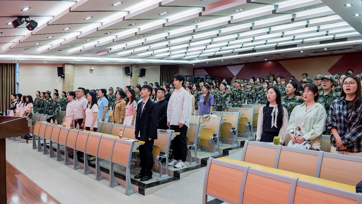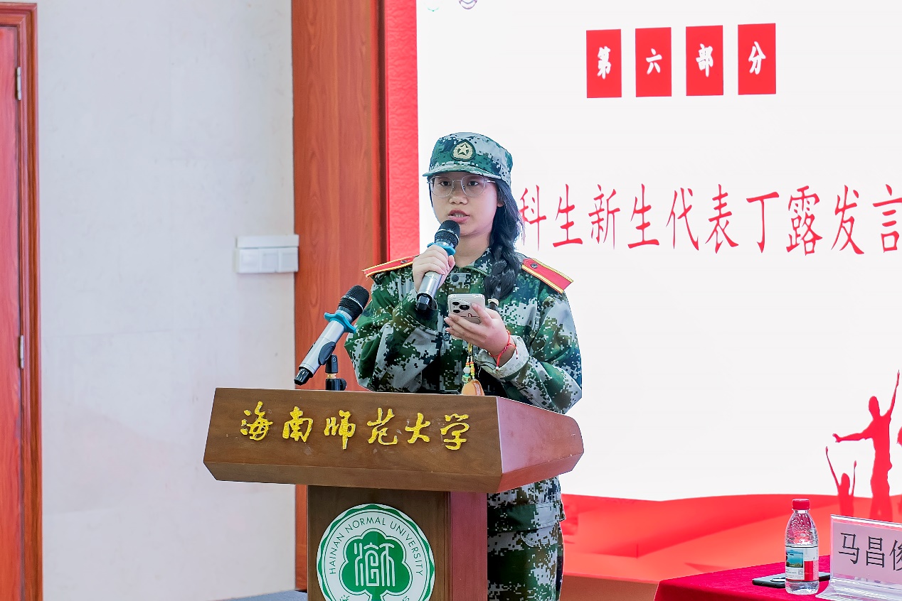 本科生新生代表丁露同学表达了对学院领导、老师、教官以及学长学姐的感激之情,她分享了军训经历带来的成长。她表示,将以“崇德尚学,求是创新”的态度去迎接每一次挑战,珍惜每一次机遇。她期待在本专业中与同学们共同成长,成为一座联结中国与世界的文化桥梁,为中华文化的传播贡献力量。