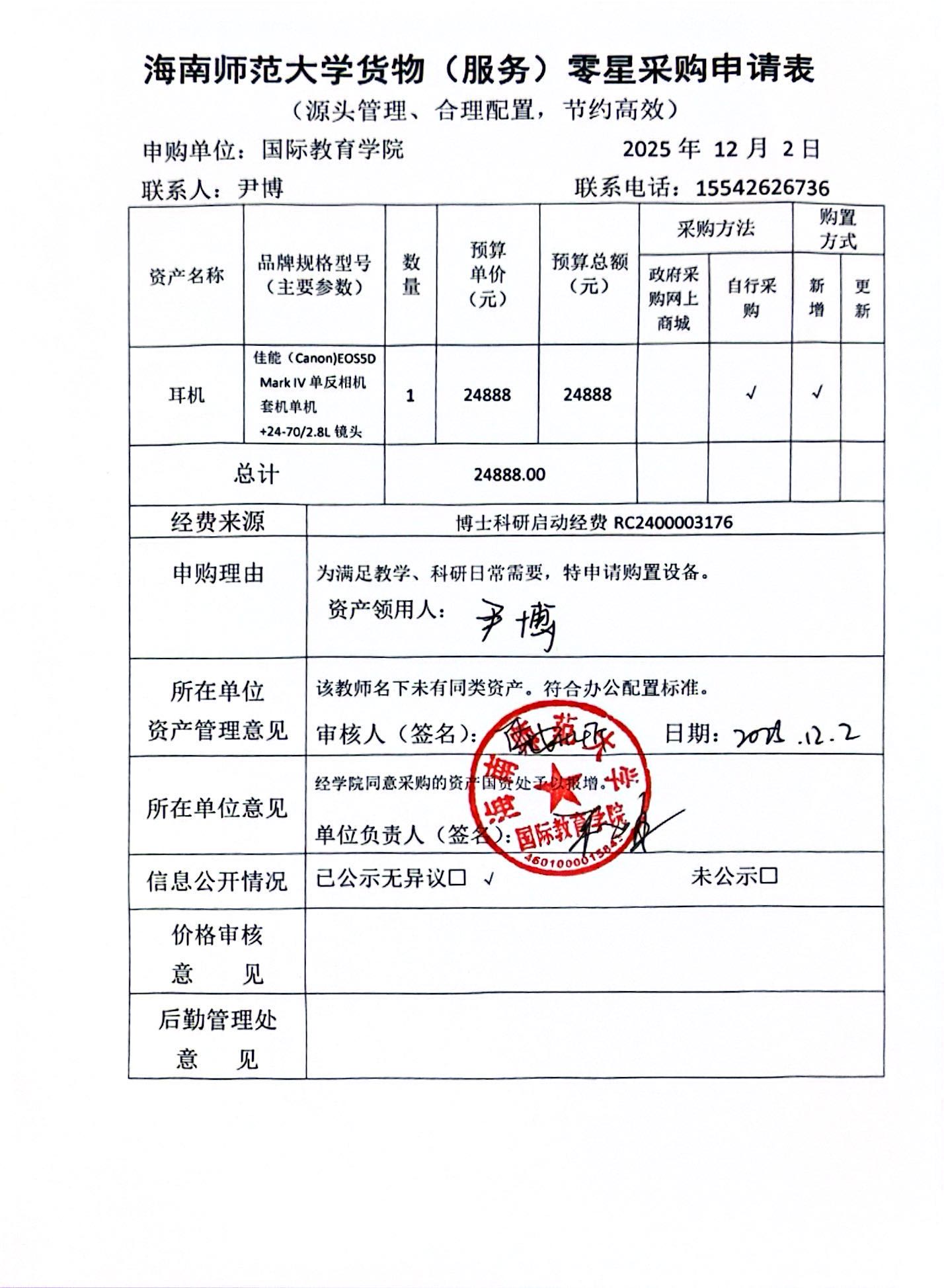 因教师科研、教学日常需要,我院教师特申请购买单反相机设备一部。经费来源为博士科研启动项目经费(RC2400003176)。