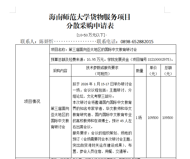 随着海南自由贸易港封关运作全面启动,海南的国际中文教育进入了全新时代。如何实现高质量创新发展自贸港国际中文教育,成为备受关注的热点问题,我院拟举办“第三届面向亚太地区的国际中文教育研讨会”,现将服务采购公示如下,公示期3天。如有疑义,拨打办公电话:65882015。