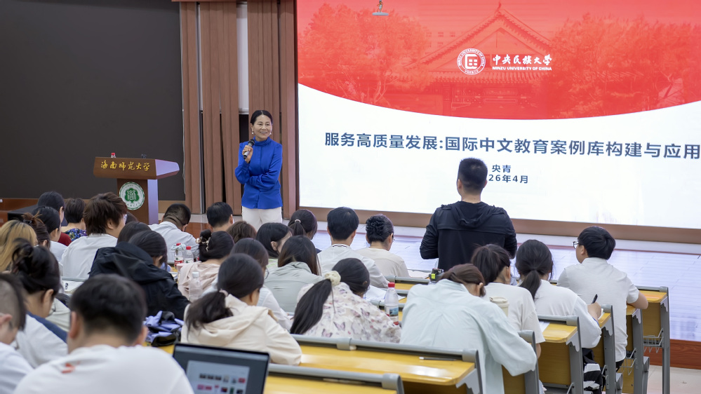 2026年4月7日,中央民族大学国际教育学院副教授、硕士生导师央青应邀到海南师范大学国际教育学院,以《服务高质量发展:国际中文教育案例库构建与应用》为题开展专题学术讲座。本次讲座由国际教育学院院长耿娟主持,学院党委书记吴辰、副院长牟鸿月及全体教师、研究生、本科生共同参加。