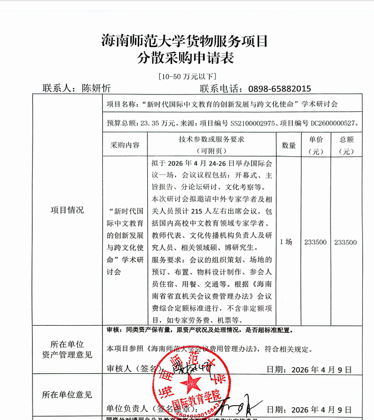 随为深入贯彻新时代教育对外开放战略,立足海南自由贸易港建设的独特区位优势,聚焦国际中文教育的创新发展与跨文化传播使命,促进国际中文教育领域的学术交流与成果共享,学院拟于2026年4月24日至26日在海口举办“新时代国际中文教育的创新发展与跨文化使命”学术研讨会。现将服务采购公示如下,公示期4月15-17日。如有疑义,拨打办公电话:65882015。